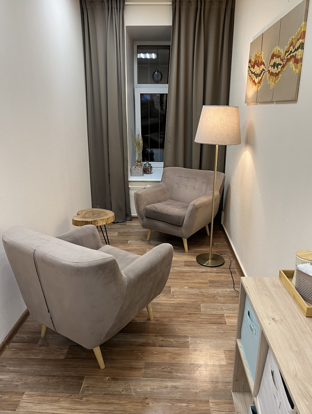 Уютный, небольшой кабинет, идеально подходящий для индивидуальных консультаций. Для этого в помещении есть всё необходимое: два мягких широких кресла, торшер, стойка для воды и чая. Окна кабинета выходят во двор.